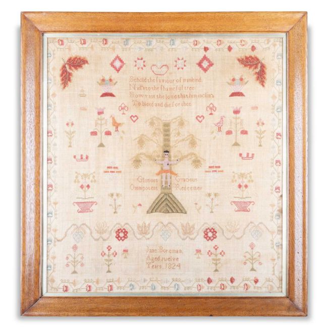 worked by Jane Boreman, aged twelve years, 1824, in an oak framed. Overall 62.5cm by 59cm