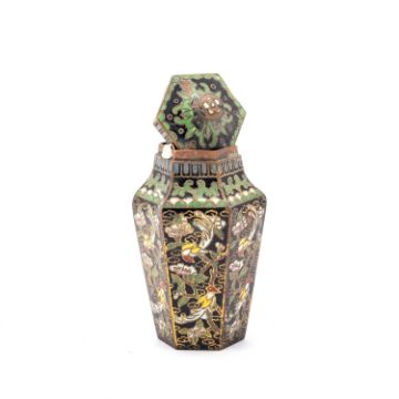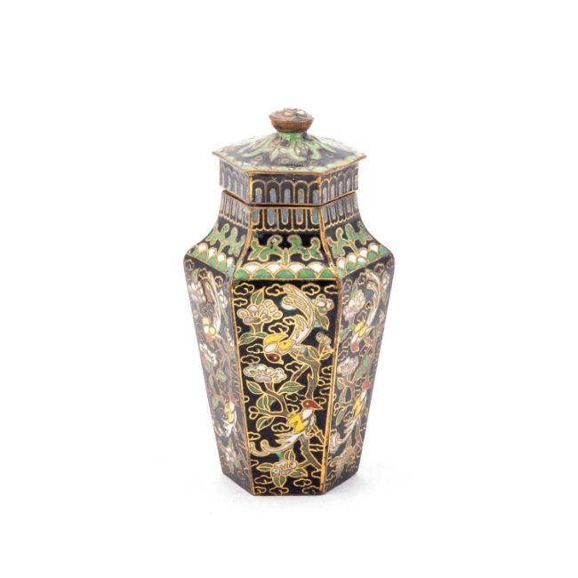 of shouldered hexagonal form, decorated with birds amidst branches. 8cm high