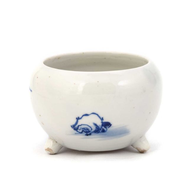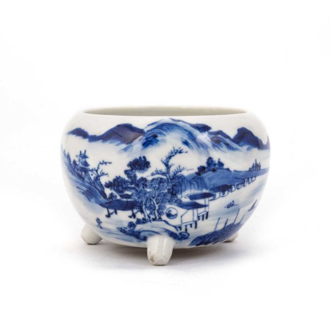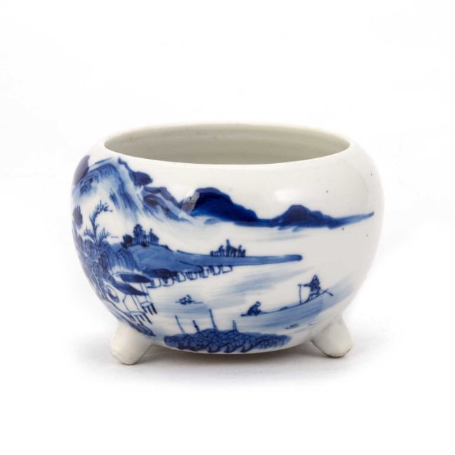 the small censer painted with figures in a boat, with houses and mountains in the background, probably 18th Century. 8cm high, 11.5cm diameter