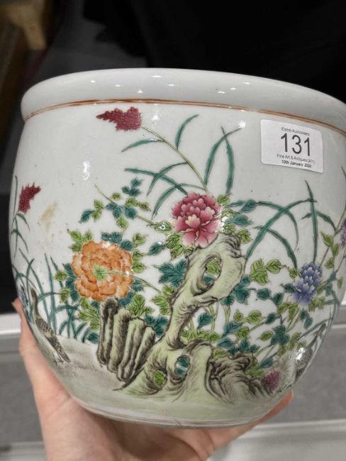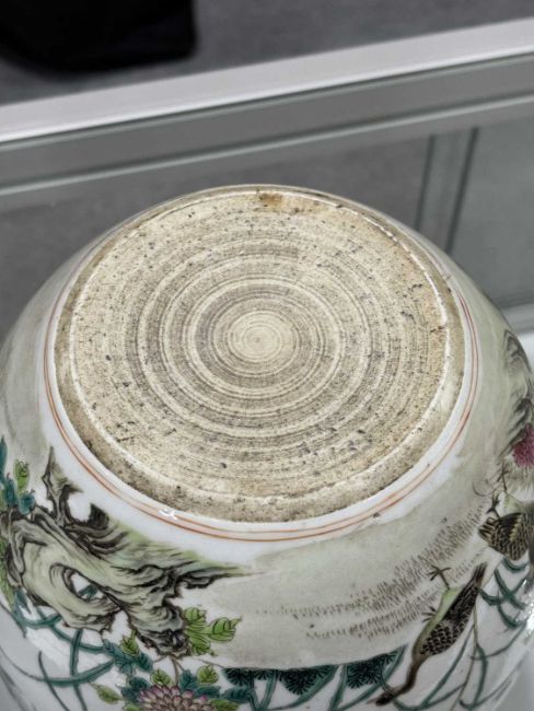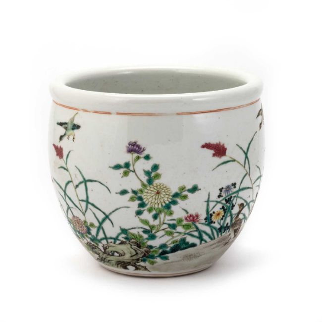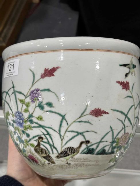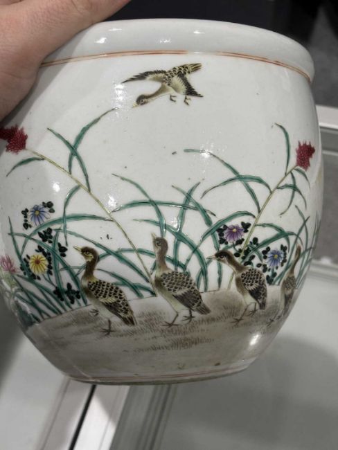 circular, painted with ducks, flowers and foliage. 17cm high, 19.5cm diameter