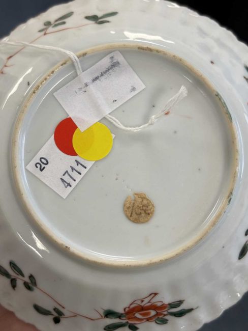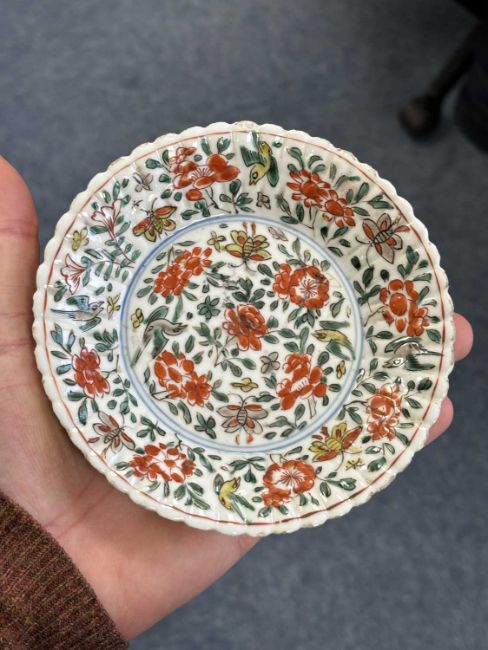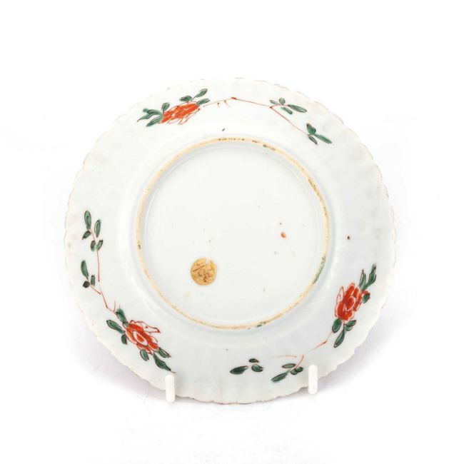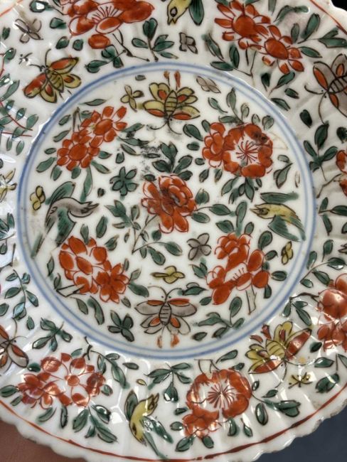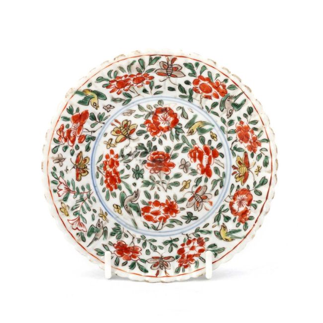 the chrysanthemum petal-moulded dish painted in red, green, yellow and aubergine enamels with butterflies, flowerheads and foliate scrolls, two underglaze blue rings to the centre. 12.5cm diameter