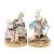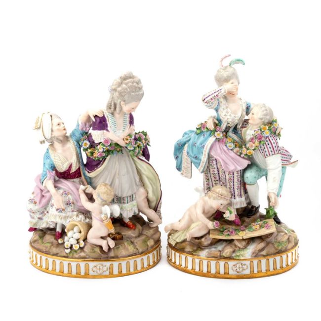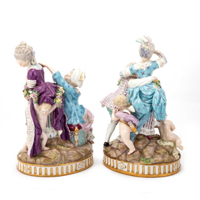 late 19th Century, after the models by M.V. Acier, the first modelled with a gallant stooping to support his female companion, a broken bridge and an attendant putto scattering roses before them, the reverse with Cupid lending his support; the second with a lady standing with her hands crossed at her breast and turning away from a seated older companion, an upturned basket of eggs at her feet and Cupid kneeling before them, the reverse with a putto hiding amongst the flounces of her skirt, each on a rocky mound above an oval stop-fluted base, underglaze blue crossed swords, incised F.63 and F.65, each with old Sotheby & Co label. (2) 24.5cm high
