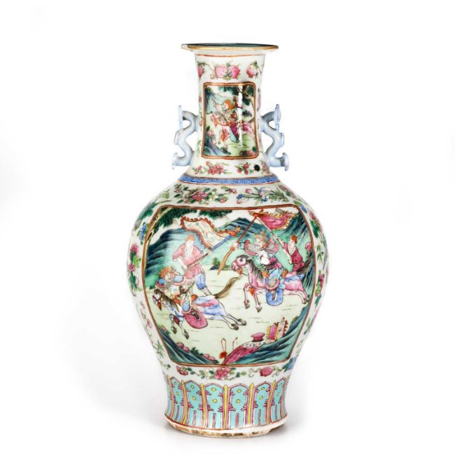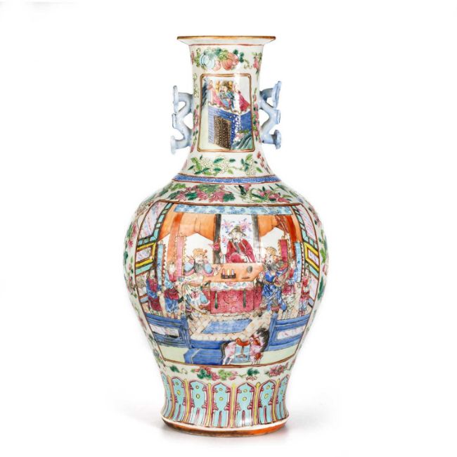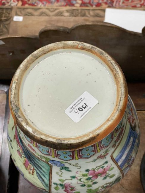 of baluster form, typically enamel painted in the characteristic palette. (2) 42cm high
