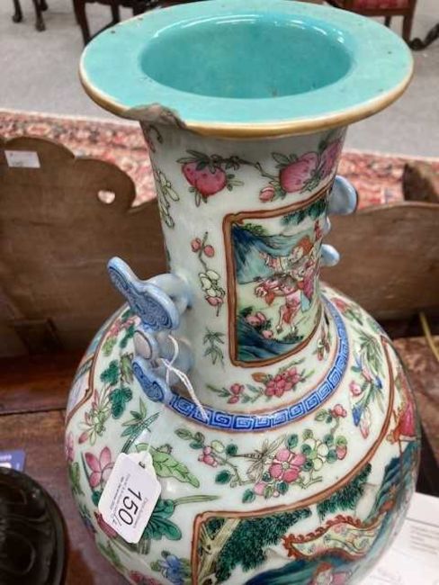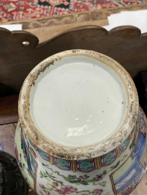 There is a large chip to the rim of one of the vases, the other vase has been broken and visible restoration across the whole of the body, additional photographs attached