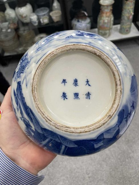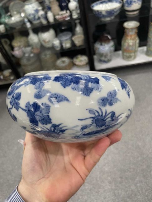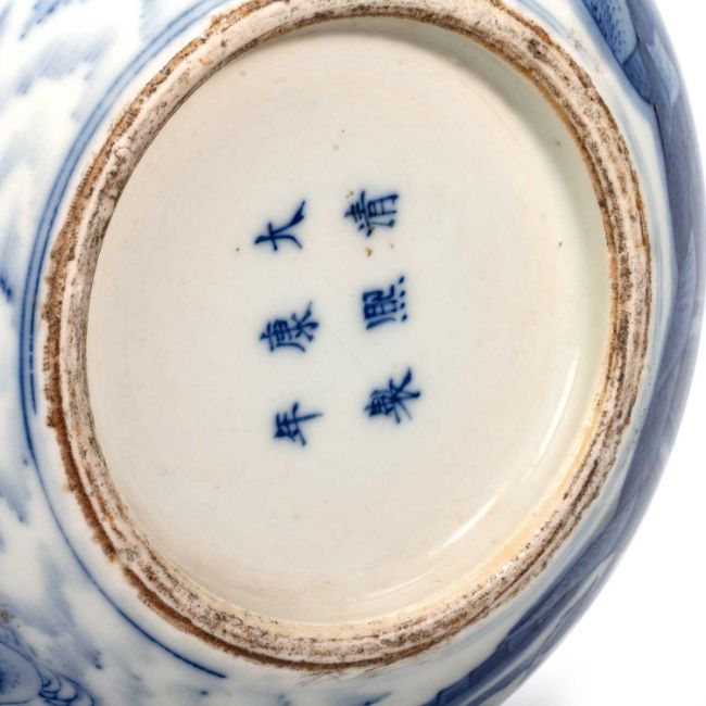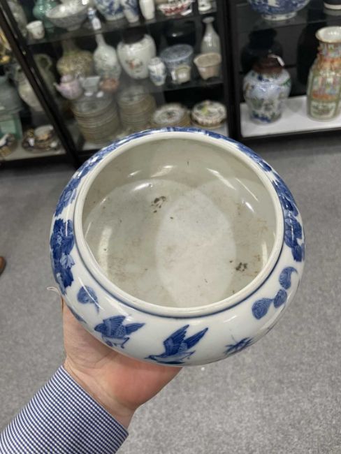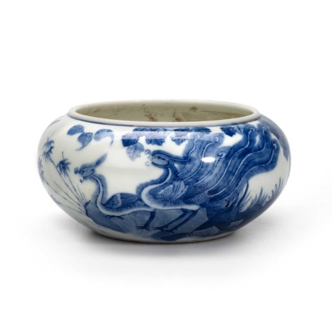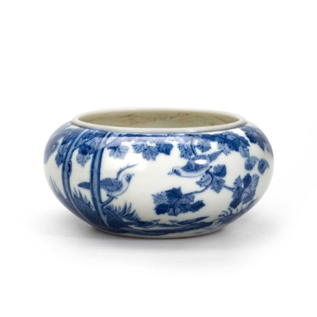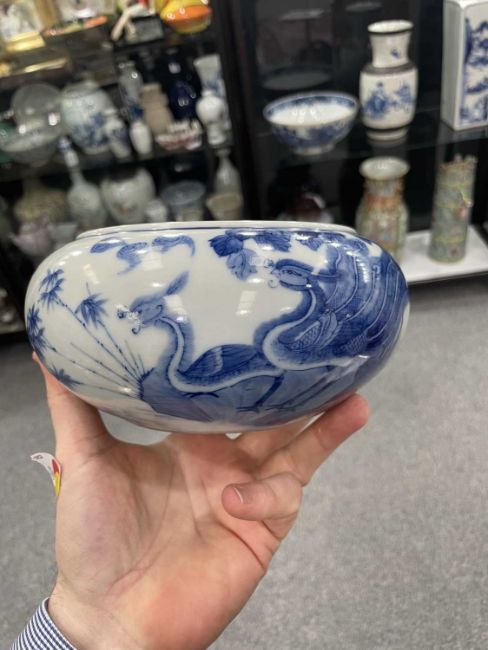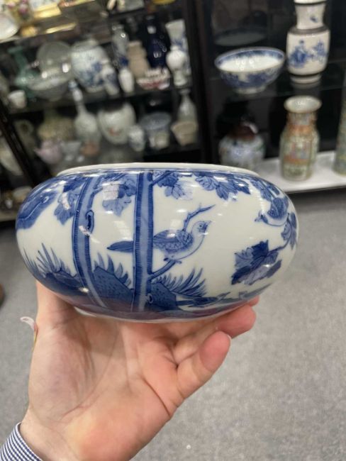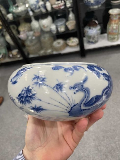circular, underglaze blue painted with a Phoenix and other birds by a river, bears underglaze blue six-character mark. 18cm diameter