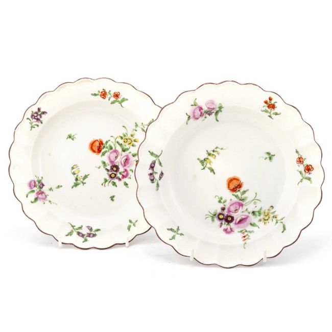 each with a scalloped edge, painted with floral sprays. (2) 21cm diameter