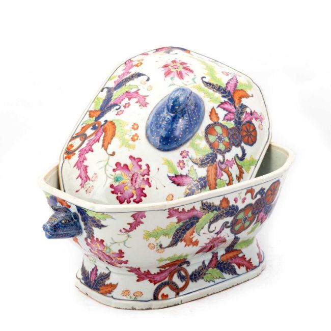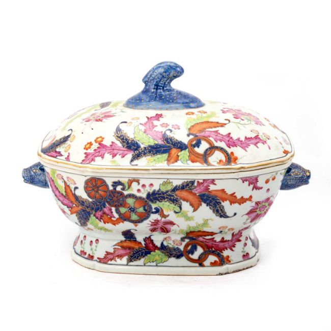 painted in rich enamels with brightly coloured serrated leaves in underglaze cobalt blue, lime green, iron red and pink with gilt highlights, interspersed with composite hibiscus (rose mallow) and composite octa-foil 'segmented pomegranate and pin-wheel flowerhead' design with further hibiscus. 35cm wide