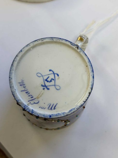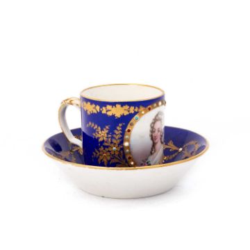 the cup painted with a titled portrait of Madame Elisabeth, the saucer with a gilded coronet and monogram, each with a cobalt blue ground enriched with gilding and red, white and turquoise 'jewels', pseudo Sèvres marks. (2) Saucer 12.5cm diameter