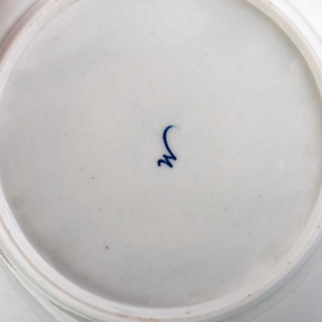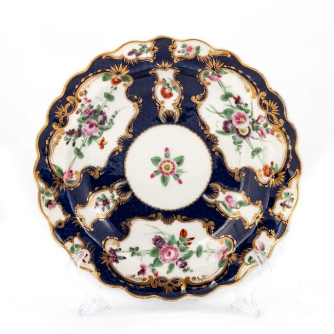 with a scalloped edge, painted with three large panels of flowers, alternating with smaller panels of flowers, within gilt scrolled borders, script W. 19cm diameter
