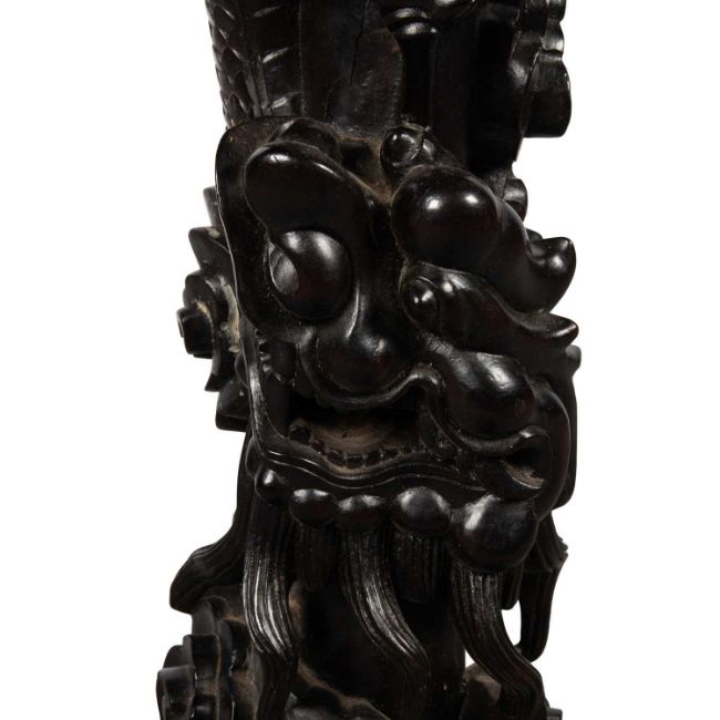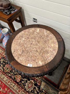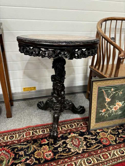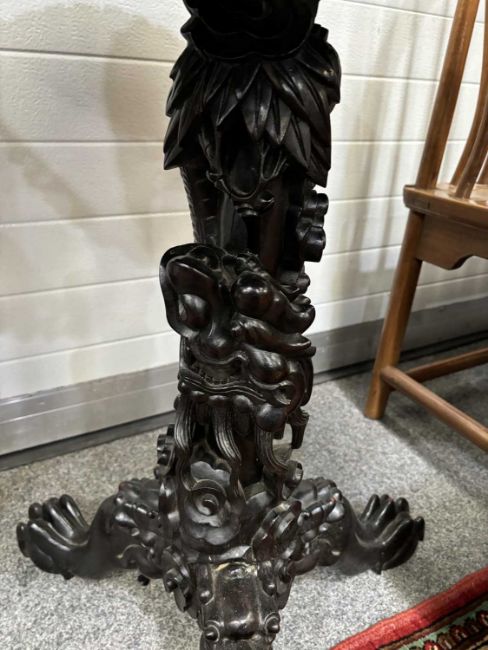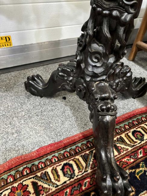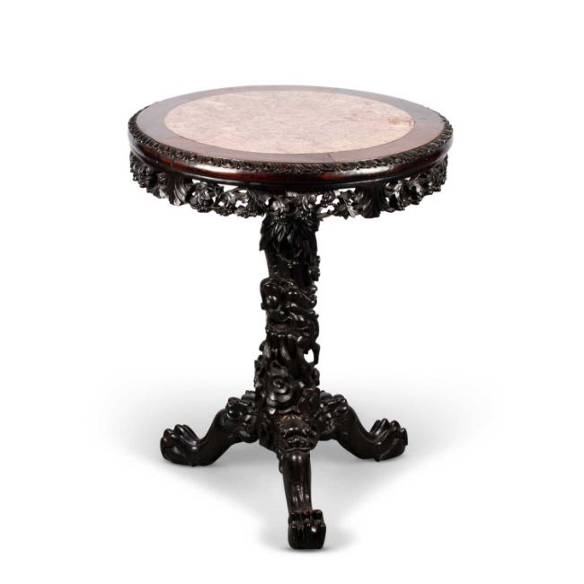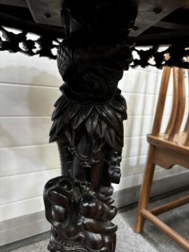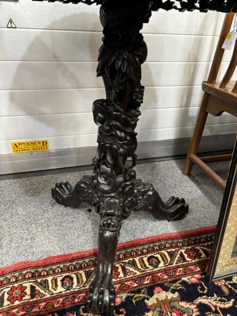 the circular top with a leaf-carved edge above a pierced frieze carved with fruiting vine, the stem boldly carved as a dragon, raised on a carved tripod base with ball and claw feet. 77cm high, 63cm diameter