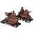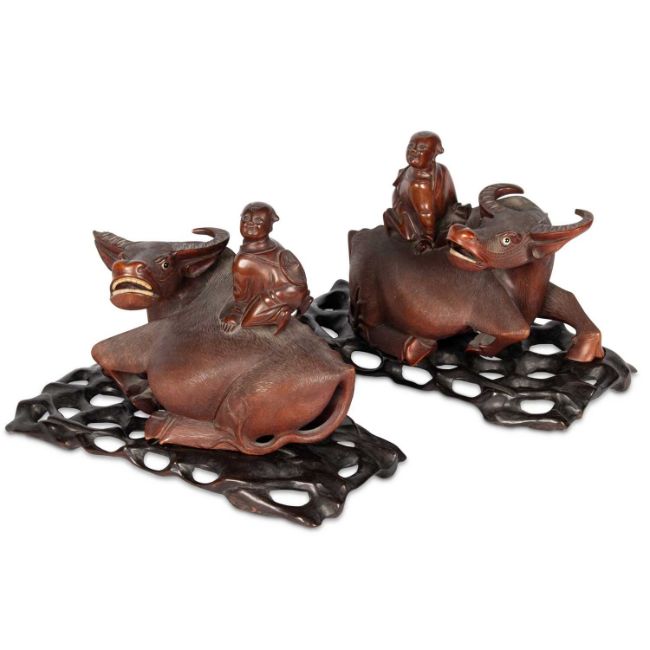 each recumbent with a figure climbing on its back, with glass eyes and bone teeth, on hardwood stands. (2) 31.5cm wide overall