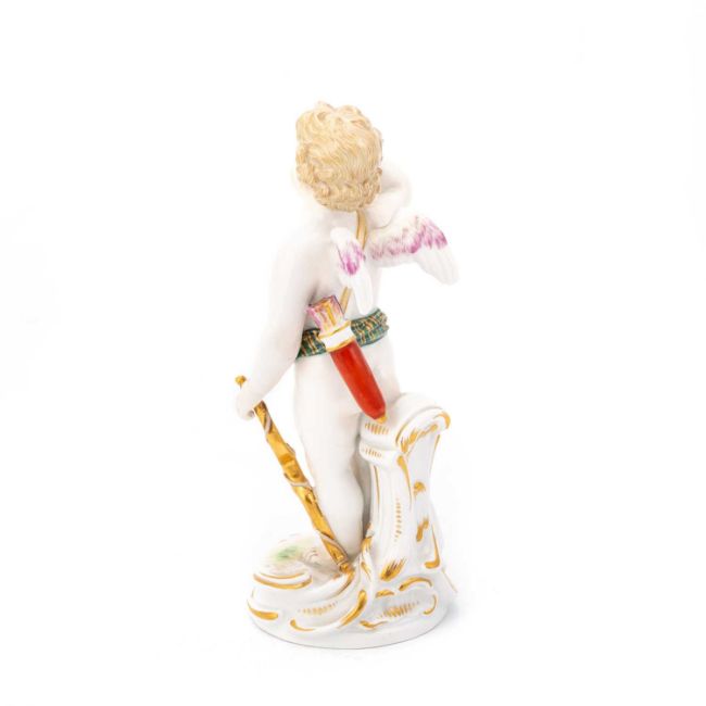 modelled standing saluting with his bow by his side on a gilt enriched scroll moulded base, crossed swords in underglaze blue and incised marks. 15.5cm high