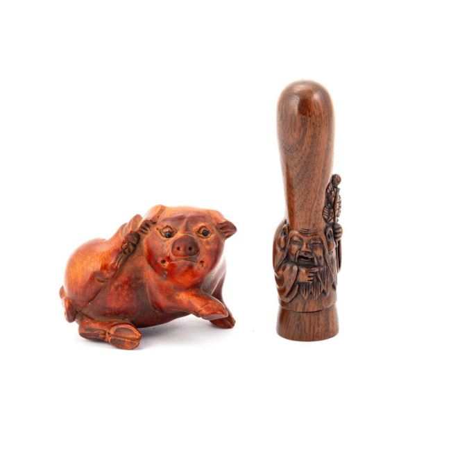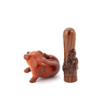the first carved as a pig scratching its ear, signed on the underside; the second as a immortal holding a turtle above his ear. (2) Pig 4cm high