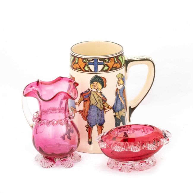 decorated with cavaliers, D4749, green printed factory mark; together with a Victorian cranberry glass cream jug and sugar bowl. (3) Mug 14cm high