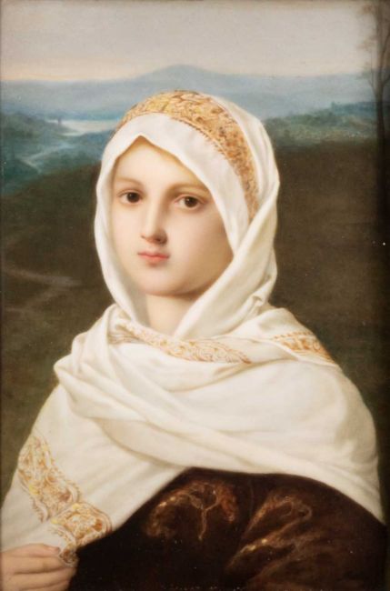 painted with the portrait of a young girl in an Italianate river landscape, impressed KPM and sceptre mark, indistinctly signed lower right, in a gilt scroll frame. Visible plaque 23cm by 15cm
