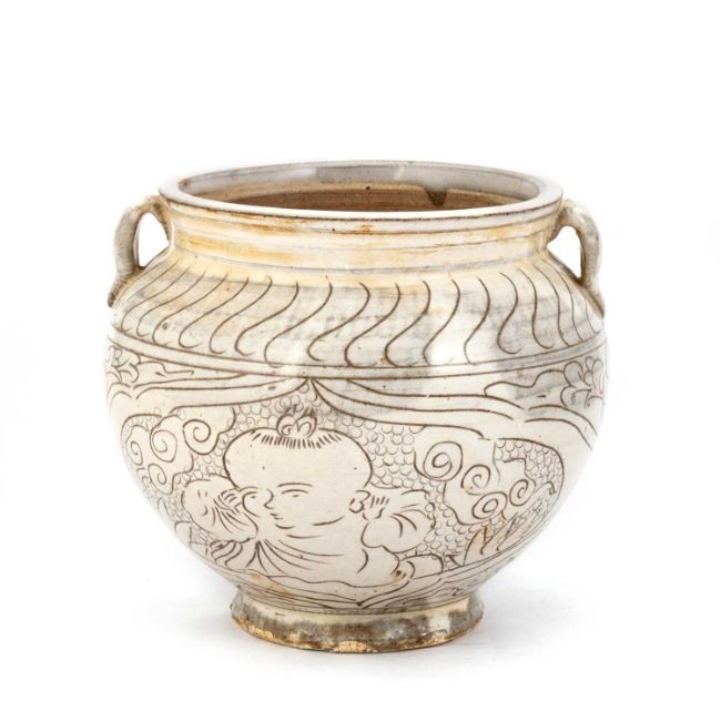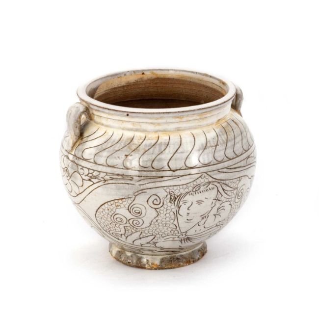 sgraffito decorated with vignettes depicting boys. 14cm high