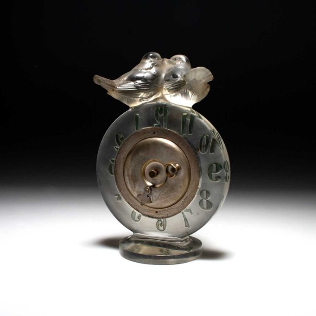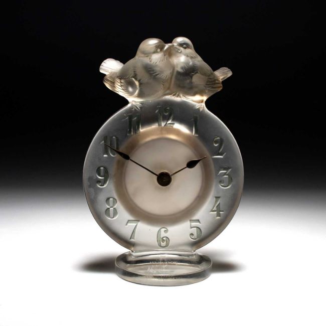 RENÉ LALIQUE (FRENCH, 1860-1945), AN 'ANTOINETTE' CLOCK, DESIGNED 1931 frosted and polished glass, stencilled R. LALIQUE FRANCE. 15.5cm high Winds and runs ok but not monitored for any length of time (unwarranted). Flea bite to the tip of the tail of one bird. In generally good condition.Because of the difficulty in determining whether an item of glass has been repolished, reference is only made to visible chips and cracks. No mention is made of repolishing, severe or otherwise.