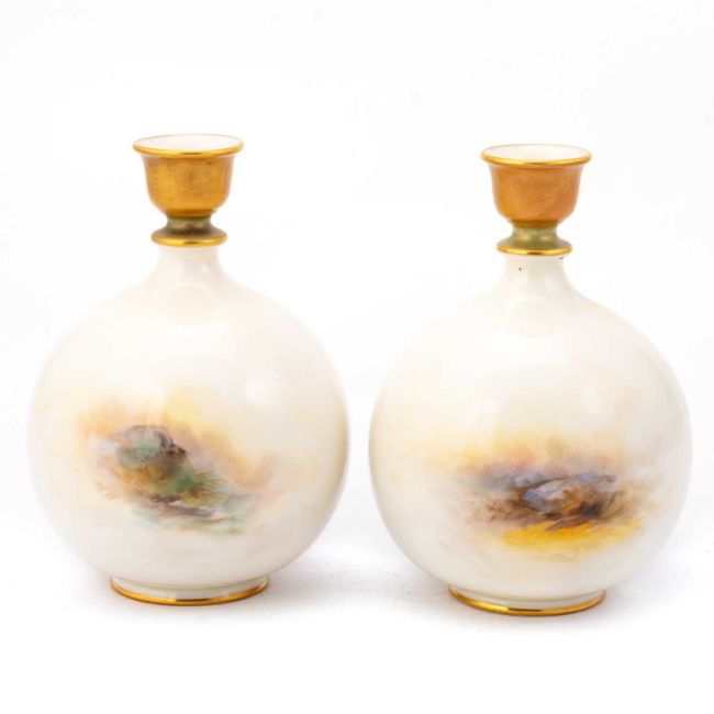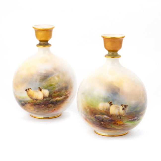 of globular form, the nozzle-shaped necks picked out in bronze, green and gold, painted with sheep standing amongst the heather in misty, mountainous landscapes, each reverse with a vignette of a rocky outcrop, signed H. Davis, nos. F123/H, puce printed factory marks. (2) 15.5cm high