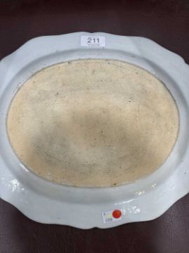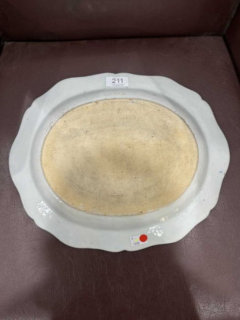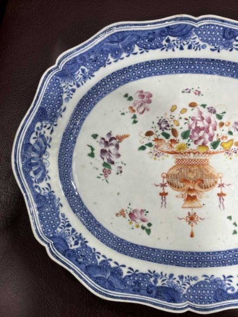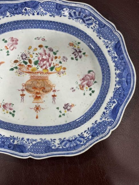 shaped oval form, enamel painted with a basket of flowers and scattered flowers. 37cm by 30cm