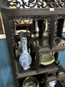 with an arrangement of shelves before a mirror-back, pierced and foliate carved borders. 52cm high, 77cm wide, 37cm deep