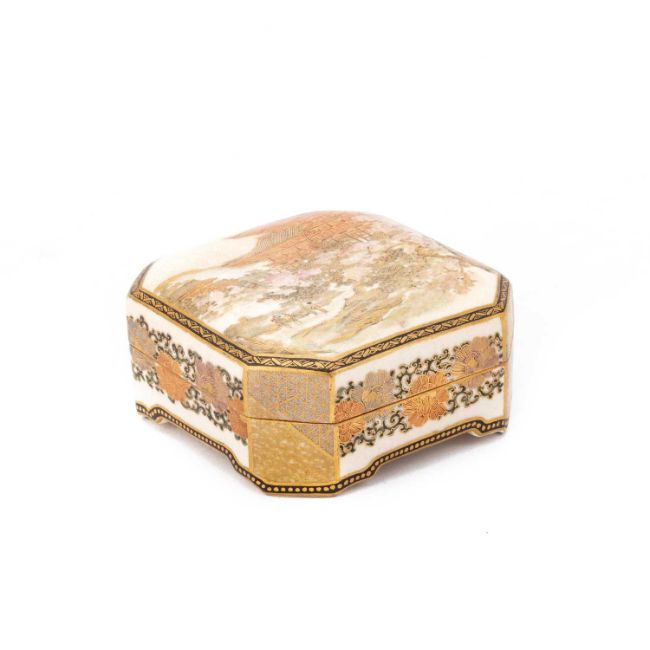 square with canted corners, the cover finely painted with figures walking a path towards pagodas, the sides decorated with flowers, the underside of the cover and interior base painted with a spray of flowerheads, signed. 8cm square