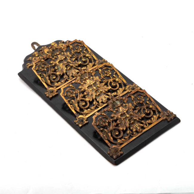 of shaped rectangular form, with three applied letter slots, each holder cast with a Green Man mask surrounded by scrolling foliage, surmounted by two cherubs to either side of a vacant oval cartouche. 28cm high (excl. mounting bracket)