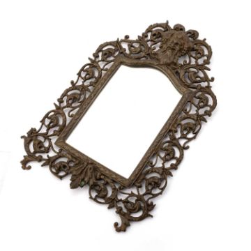 probably by Bradley & Hubbard, shaped rectangular form, the cast metal frame pierced with scrolling fruiting vines, the mirror surmounted by a Bacchus mask. 25.5cm by 37cm