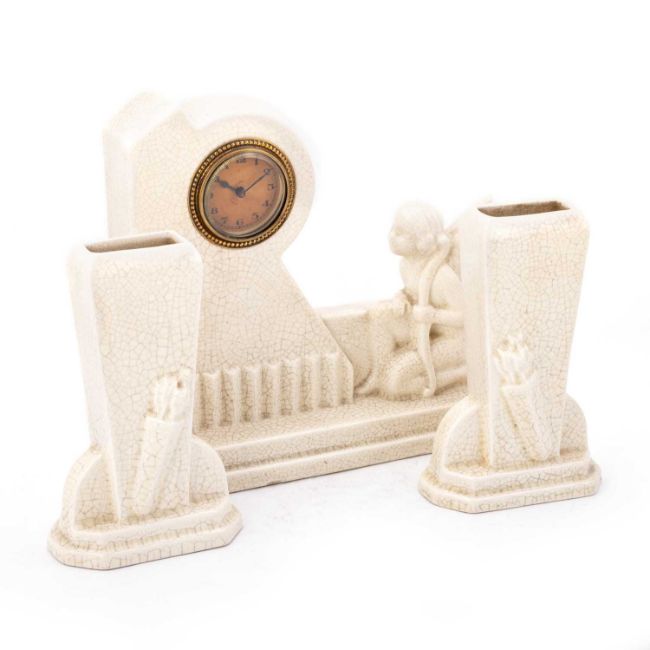 the clock with a kneeling cherub figure looking up towards the clock dial, the two vases each decorated with a quiver of arrows. (3) Clock 22cm high