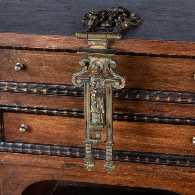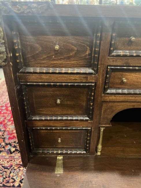 the fall-front opening to reveal an arrangement of drawers. 118.5cm high, 75cm wide, 33.5cm deep