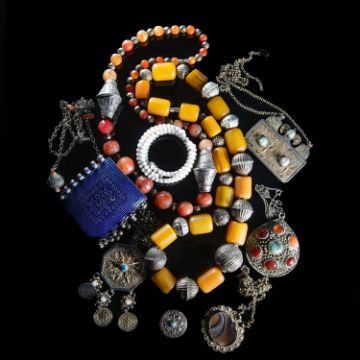 Multani necklace damage to enamel, assessed as silver pendant with base meatl or low grade silver chain; bakelite necklace some beads with dents wear commenserate with age; agate beads quite worn; turquoise very worn assessed as silver; tear drop pendantassessed as base metal with silver chain; hexagonal assessed as silver; saclloped pendant assessed as base metal.