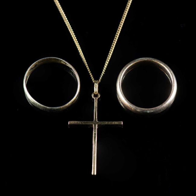 an 18 carat gold cross pendant necklace, both marked '750', pendant 4cm high (incl. bale), chain 44cm long, 5 grams gross; a 9 carat wedding band, marked '9.375', London 1929, ring size R, 6 grams; a silver-gilt wedding band, Birmingham 1884, ring size R, 2 grams. (3)