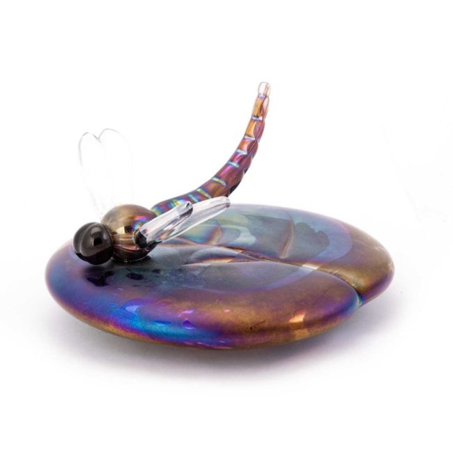 formed as a dragonfly seated on a lily pad, all in a swirling petrol iridescence, signed. 15cm wide