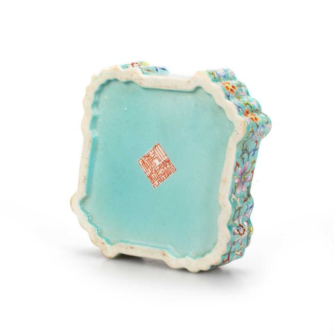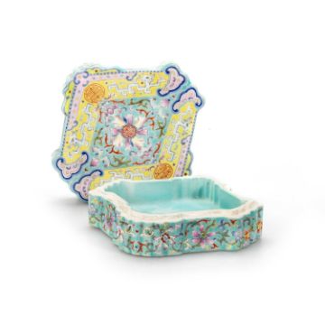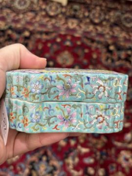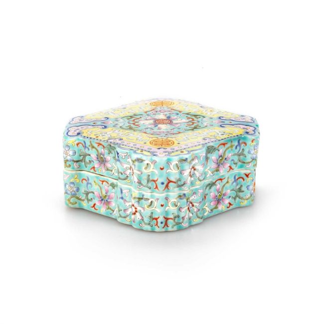 the cover enamel decorated with flowers and leaves, the sides further decorated with flowers and leaves, bears an iron-red six-character mark. 13cm wide