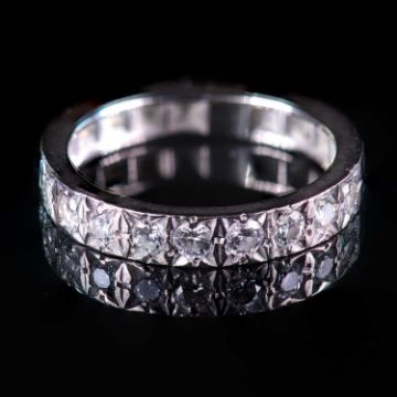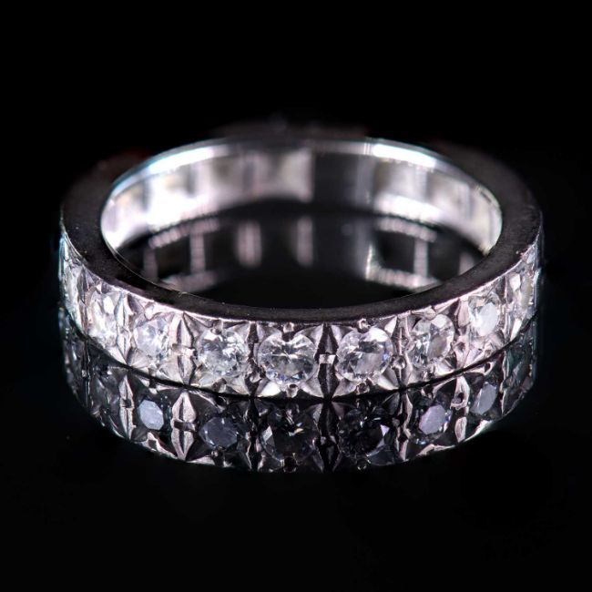 Evidence of resize which appears to be more yellow that the rest of the ring. Band designed to be a full eternity. Diamonds assessed G/H VS.