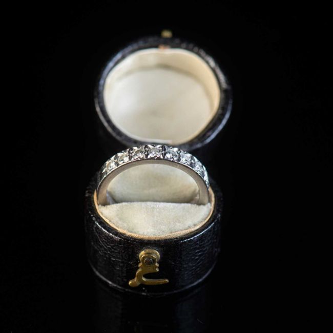 ten round brilliant-cut diamonds flush-set with a ridged band, unmarked, cased in an antique box. Ring size N1/2, assessed total diamond weight 0.50 carats, 4.7 grams gross