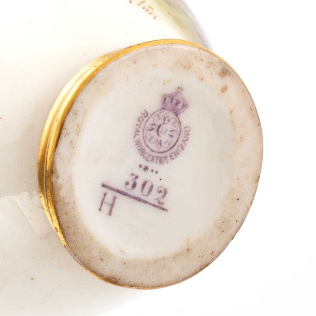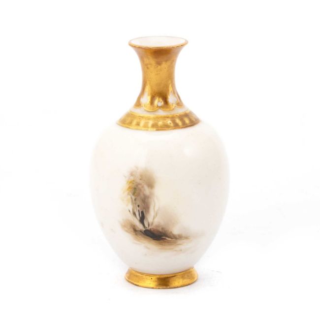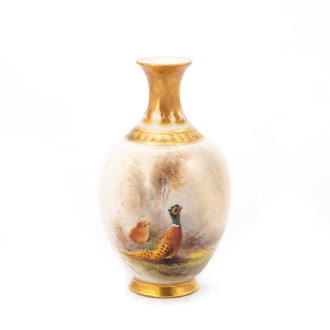 of ovoid form with a gilded foot and trumpet neck, painted with two pheasants in a woodland clearing, signed Jas Stinton, no. H302, puce printed factory mark. 11cm high