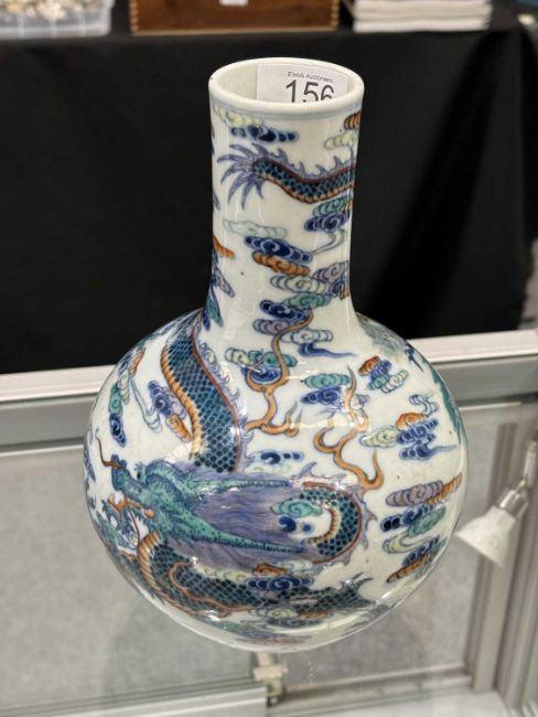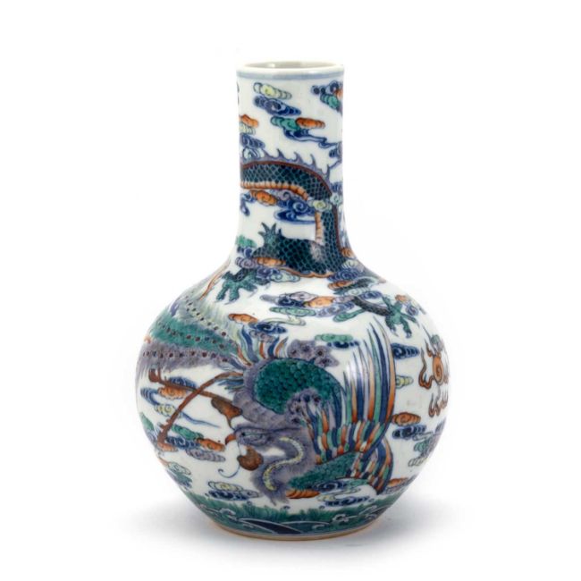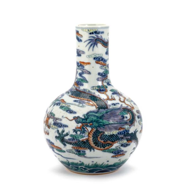 the ovoid body rising from a recessed base to a tall cylindrical neck, decorated with blue, green, yellow and red enamels, bears underglaze blue mark. 22cm high
