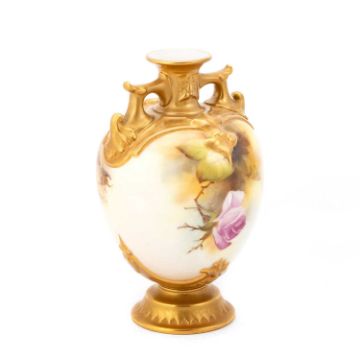 of ovoid form with twin handles, painted with Hadley-style roses, no. 1654, puce printed factory mark. 19cm high