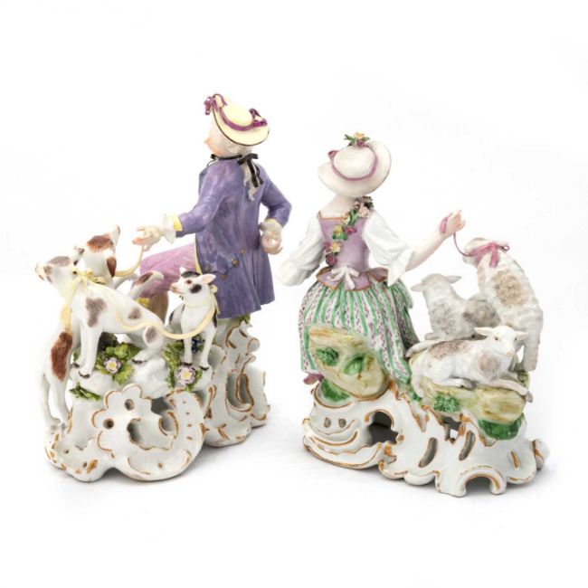 both sitting on a rocky outcrop, he with three hounds, she with three sheep, on gilt scroll-moulded bases, blue crossed swords and star marks for the Marcolini period. (2) 16cm high