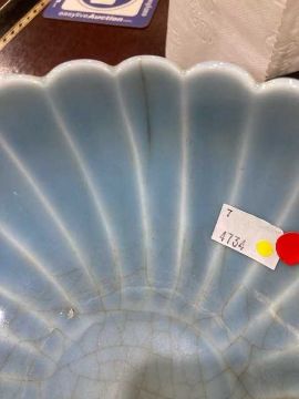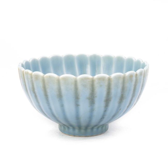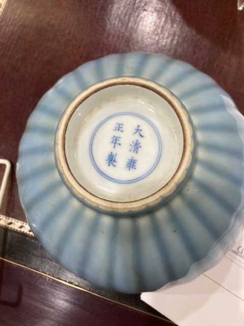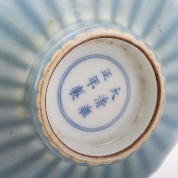 shaped as a flowerhead, the fluted U-shaped body with pale blue glaze, bears a six-character mark within double rings. 18.5cm diameter