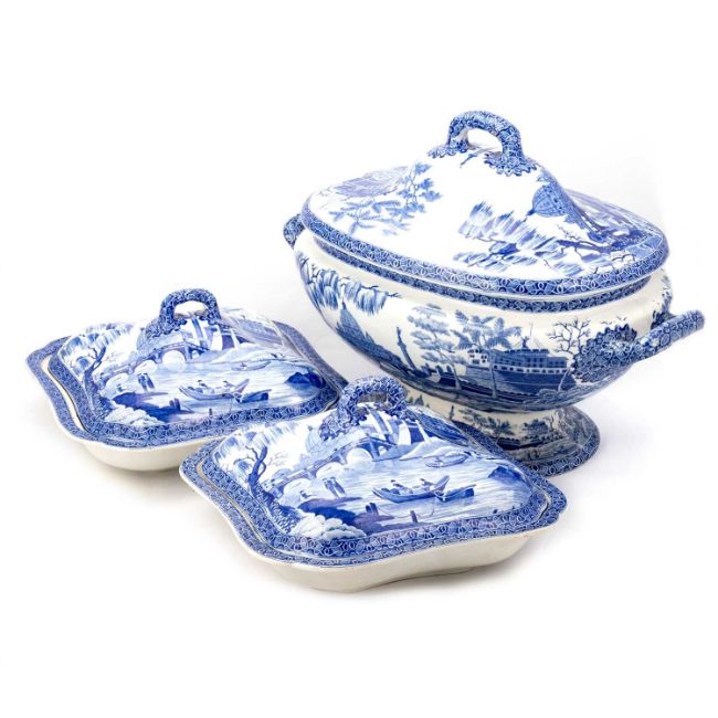 One vegetable tureen with a couple of tiny flea bites. The other vegetable tureen with slight browning in the glaze of the base. The soup tureen in very good condition. The trio is generally in good condition commensurate with age.