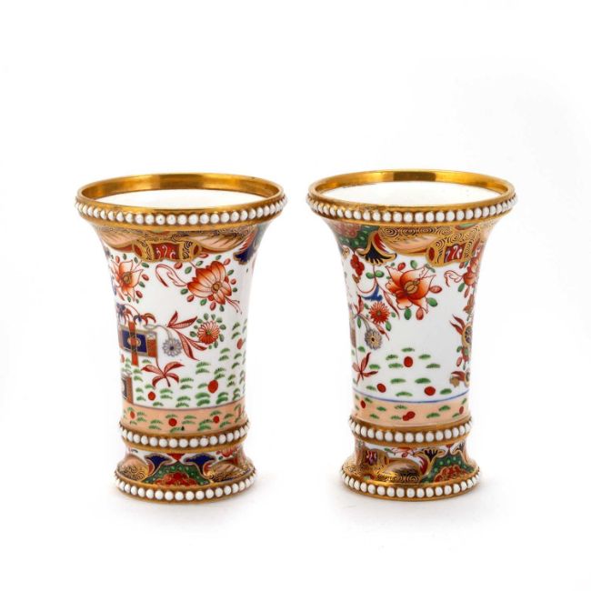 of beaker or trumpet shape with flaring rims, with three bands of moulded pearls, decorated with pattern 967 in the Imari style, one with a painted pattern number. (2) 11.5cm high