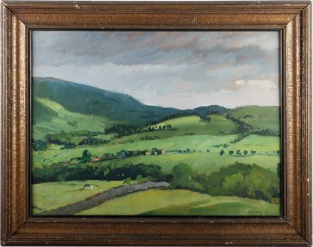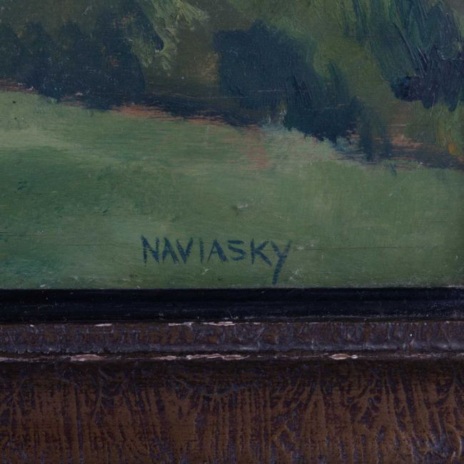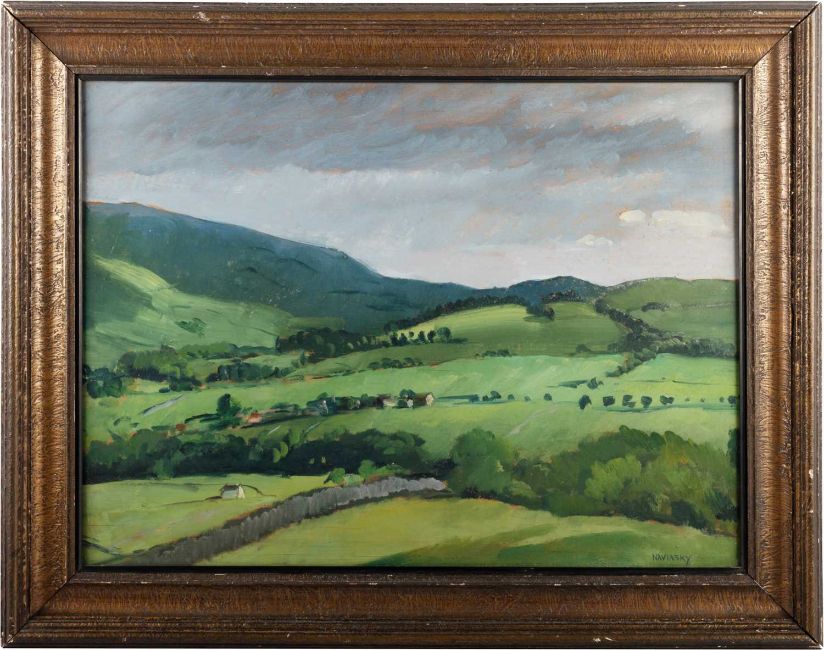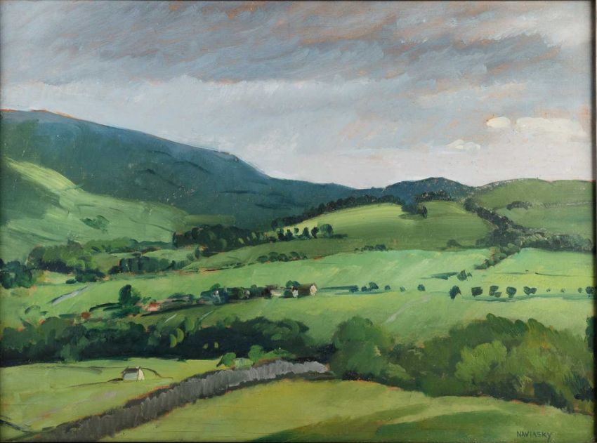 PHILIP NAVIASKY (1894-1983) COUNTRY LANDSCAPE WITH FARM BUILDINGS ‡ SignedOil on panel 43cm x 59cm