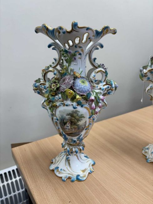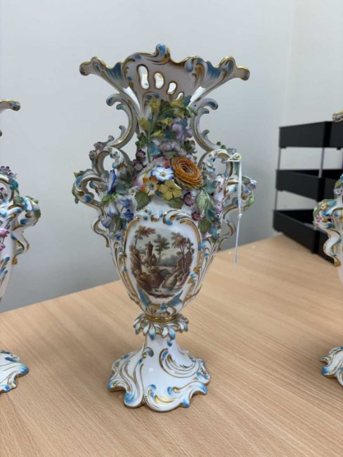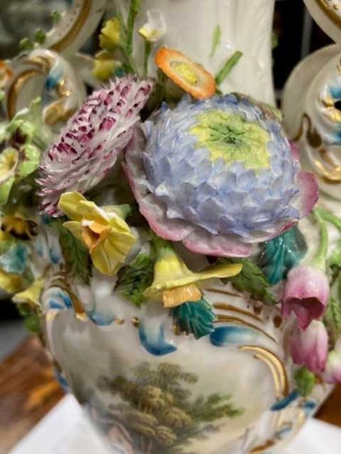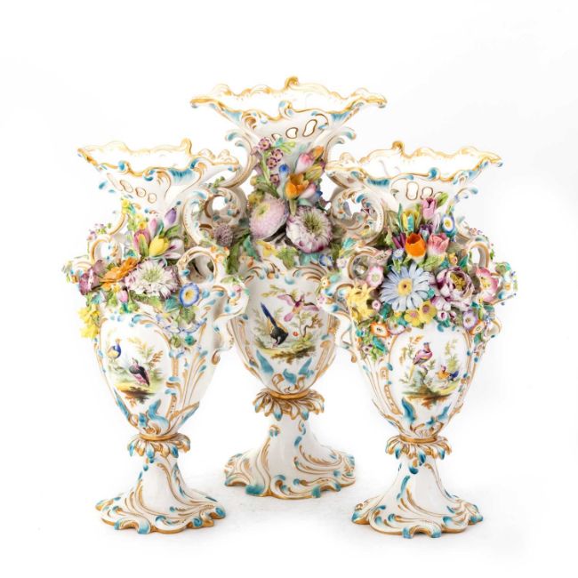 each Rococo style vase painted with exotic birds within elaborate scroll borders, the reverse painted with buildings and figures by a river, the necks and shoulders encrusted with a profusion of finely modelled flowers, painted in vibrant enamels, the elaborate scroll-form handles further encrusted with flowers, unmarked. (3) Tallest 31.5cm
