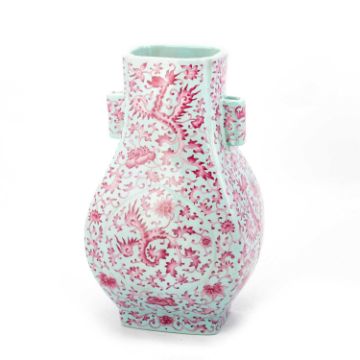 with twin cylindrical handles, decorated with Phoenix and scrolling lotus tendrils, bears iron-red mark. 30.5cm high