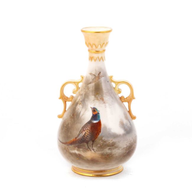 pear-shaped with applied scroll handles, the neck, handles and foot in blush ivory with gilt rims, painted with a pheasant in an autumnal landscape with a further bird in flight above, signed Jas Stinton, the reverse with a leaf study, no. G995, green printed factory mark. 14.5cm high