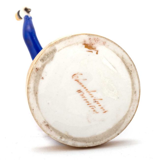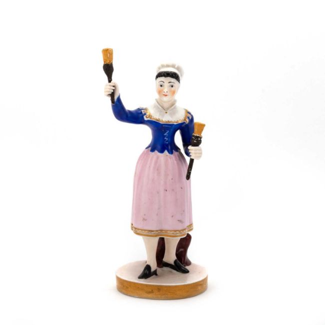 Her raised arm has been restored. The brushes are ceramic, wear to the gilding.