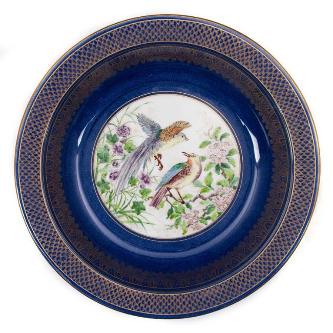 decorated in the Chinese taste, the centre painted with two birds amidst blossom, the powder-blue sides highlighted with gilding, the reverse painted in Famille Verte enamels with lion-dogs, printed and painted factory marks. 43cm diameter