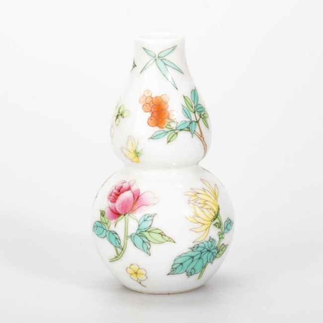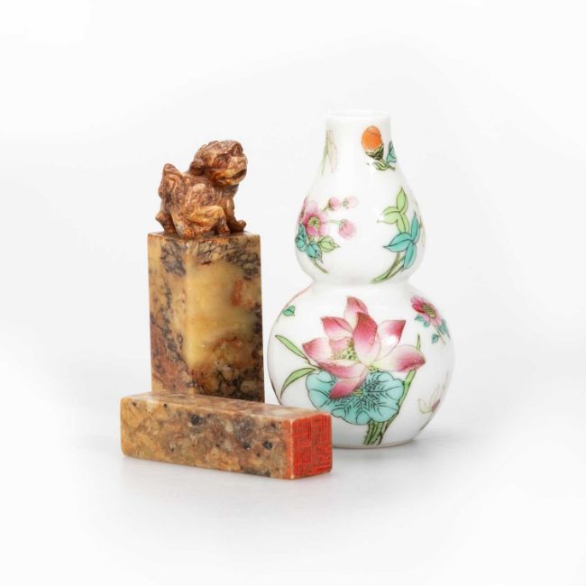 enamel painted with flowers; together with two Chinese soapstone seals. (3) Vase 10cm high