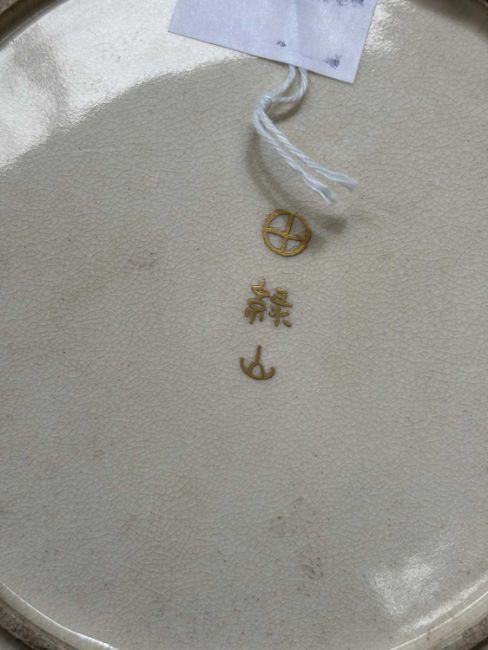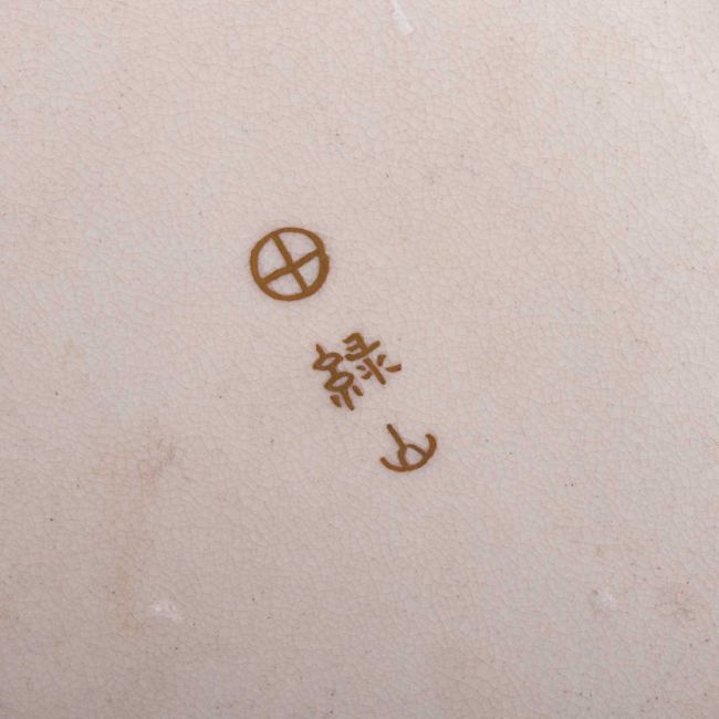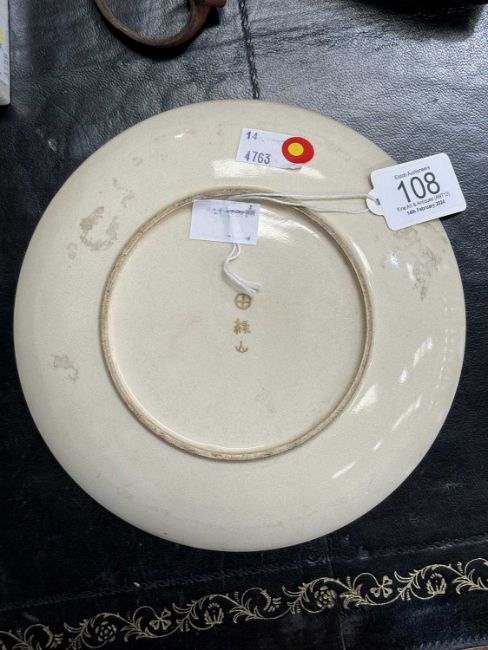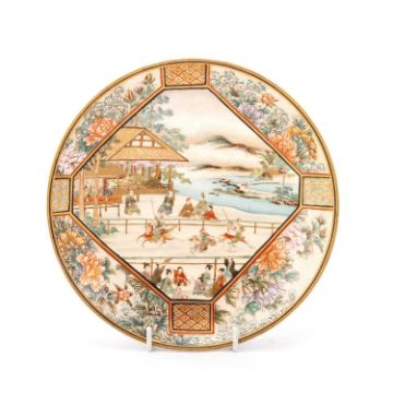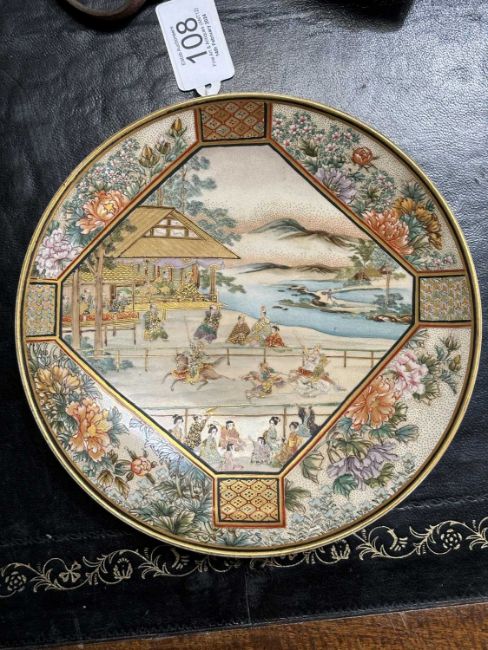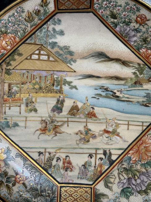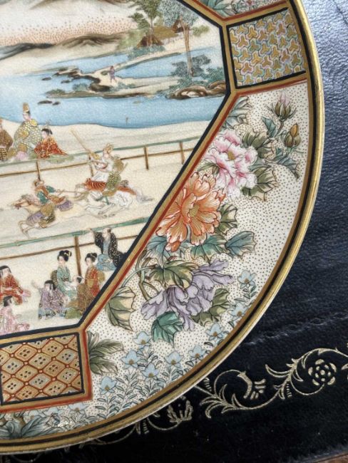 decorated with a central panel enclosing a horse racing scene, with spectators gathered around in a mountainous river landscape, within border panels of brocade design and flowering plants, signed Ryokuzan. 18.5cm diameter
